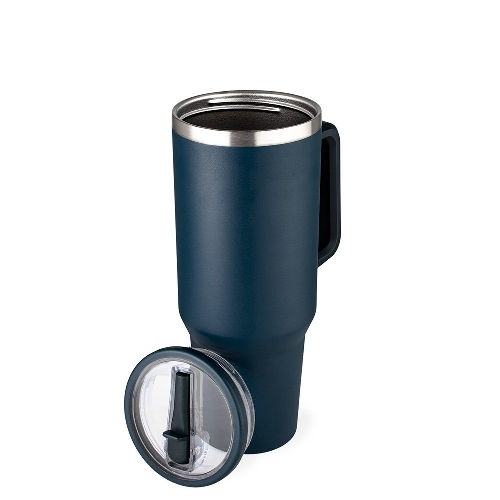 Caneca térmica em aço inox 304 com capacidade de 1,2 L e parede dupla. Possui tampa acrílica rosqueável com bico flexível para uso com canudo, pegador plástico e acompanha canudo.