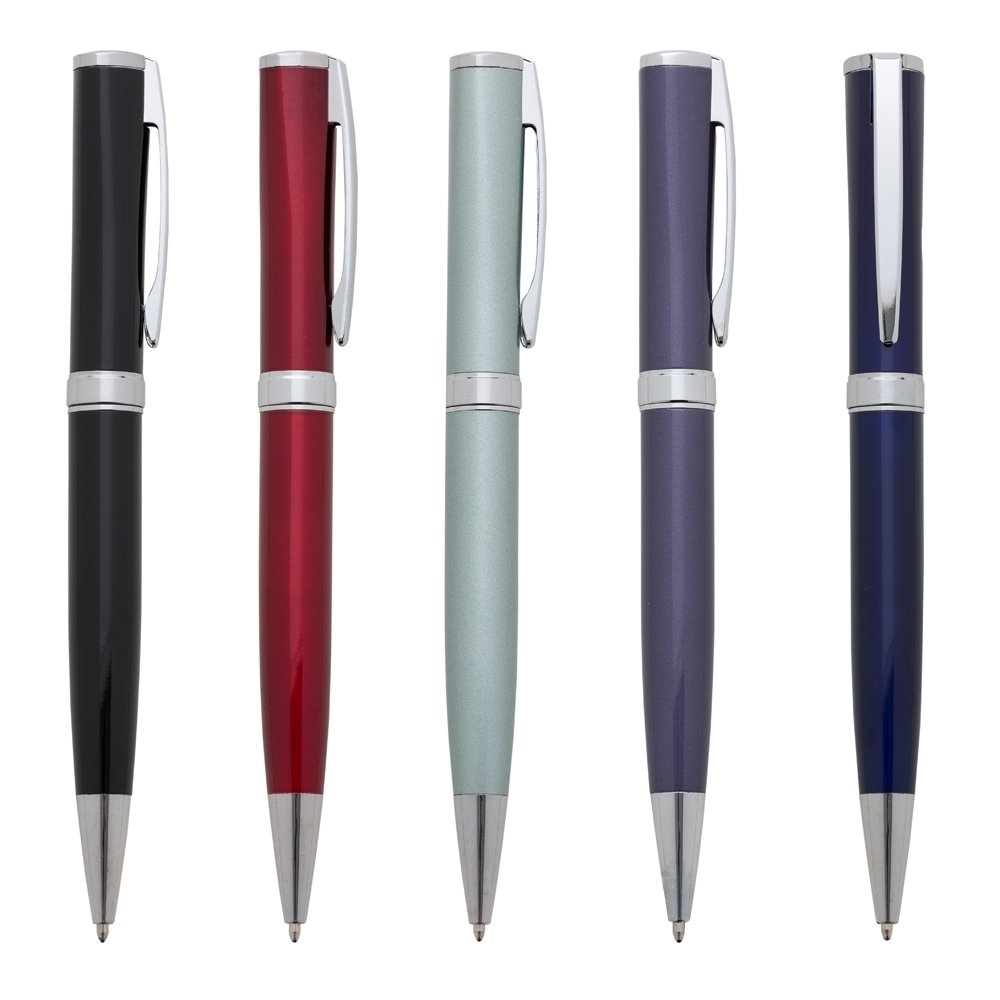 Caneta metálica com carga esferográfica azul 1.0 mm e acionamento por rotação.