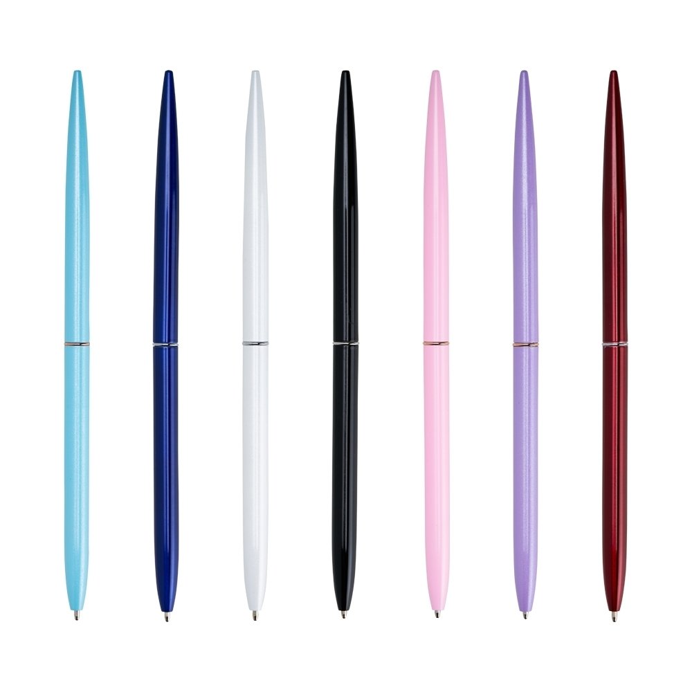 Caneta metálica com acionamento por rotação e carga esferográfica azul 1mm.