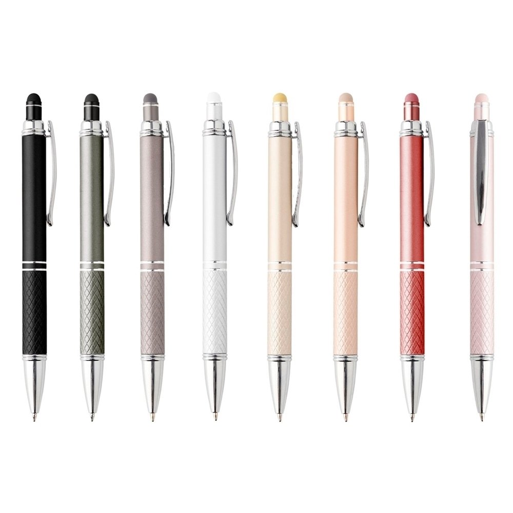 Caneta metálica touchscreen com parte inferior texturizada, acionamento por clique e carga esferográfica azul 1.0mm.