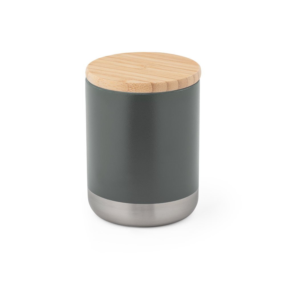 Copo térmico em aço inox com parede dupla e isolamento a vácuo, revestimento interno em cobre e capacidade de 370 ml. Possui tampa em bambu com vedação de silicone e acabamento em pintura a pó para maior durabilidade. Produto com certificação EU Food Grade e fornecido em caixa presente de papel kraft reciclado.