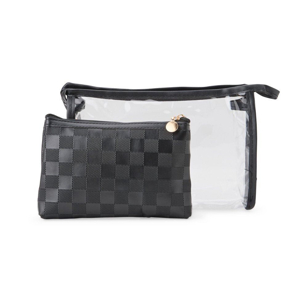 Conjunto de nécessaires em dois tamanhos diferentes. A nécessaire maior é confeccionada em PVC impermeável com detalhes em couro sintético, alça lateral e fechamento em zíper. A menor é produzida em PU impermeável, com acabamento quadriculado e fechamento em zíper.