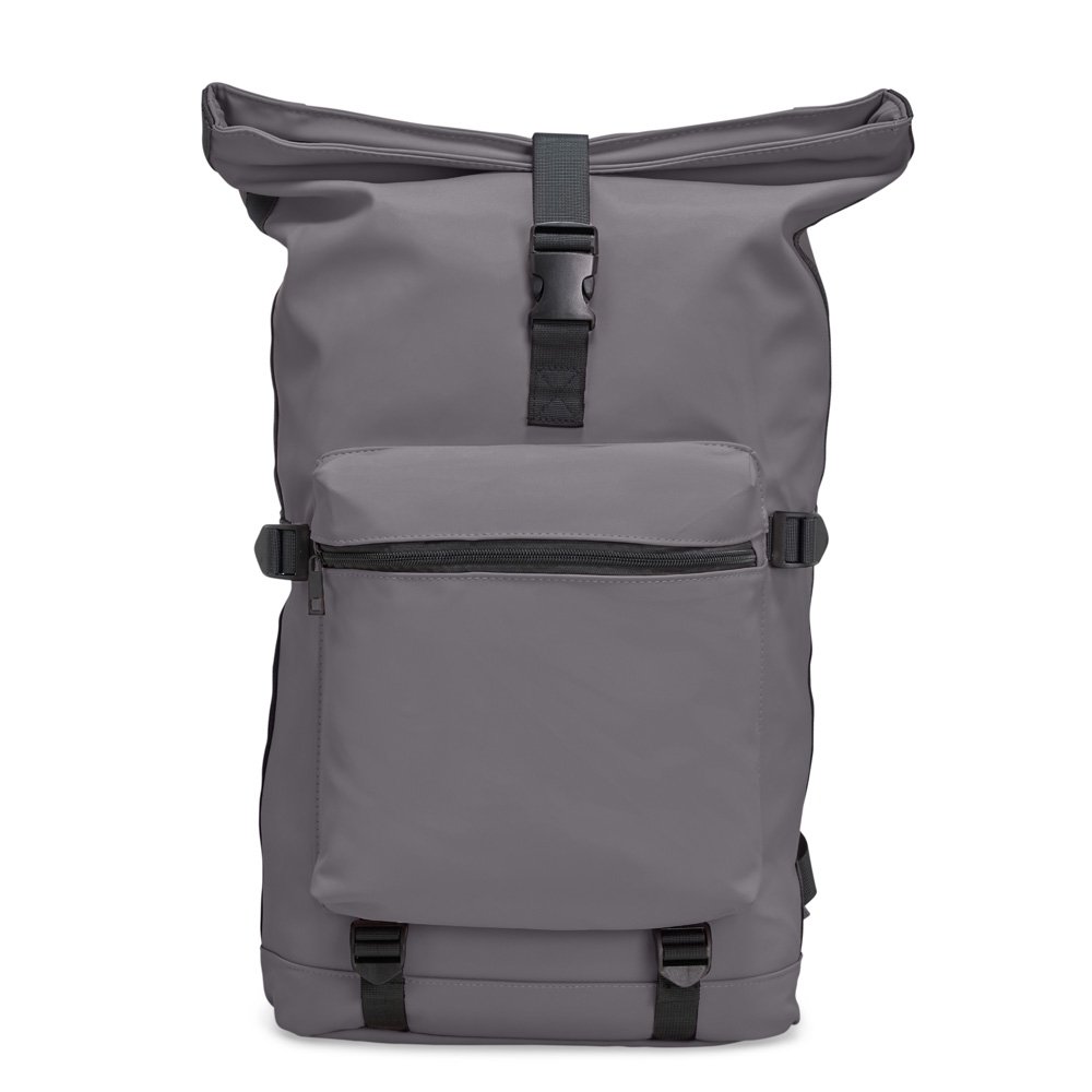 Mochila de couro sintético resistente à água com capacidade de 41 litros. Dois compartimentos, sendo o principal com bolso para notebook de 15,6”, fechamento por zíper e cintos/fivelas laterais, engate para mala de viagem.